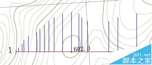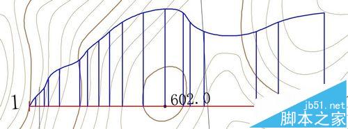 3、在剖面线与地形线交点绘制辅助线,以起点和交点的等高线的高差为长度,如下一根等高线比起点高5米则向正上方绘制5米的辅助线,低5米则向正下方绘制5米的辅助线。同时还需要注意山顶和鞍部的最高点和最低点。