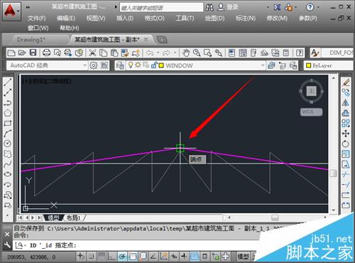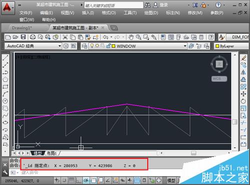 6、捕捉到该点之后,点击一下,在命令栏的上方,就会出现该店的表坐标“id 指定点: X = 286953 Y = 423986 Z = 0”,信息是非常全面的。