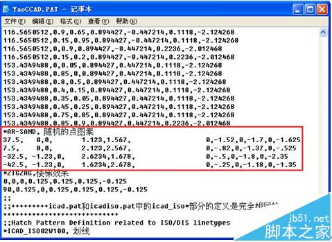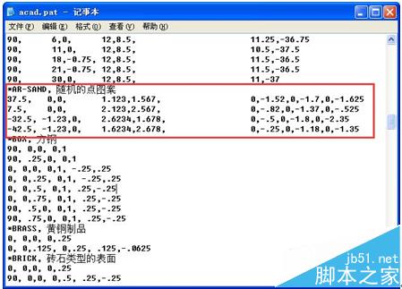 1、从AutoCAD中找到图案填充的定义文件,如XP系统中的acad2008的定义文件:C:\Documents and Settings\Administrator\Application Data\Autodesk\AutoCAD 2008\R17.1\chs\Support\acad.pat,从这个文件中找到所要剖面图案的定义,如下图是随机的点图案的定义: