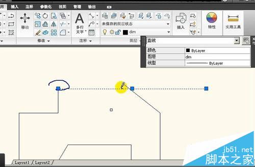1、当画图形过程中,不知道斜线长度,那与原本一条直线相交后,要闭合,可以用鼠标点击该直线,上面会呈现三个点。