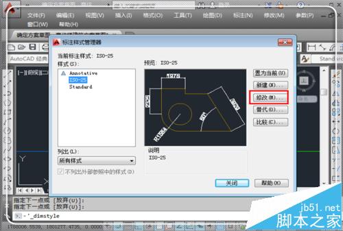 5、进入标注样式管理器,这里选择默认的当前标注样式,如果需要,可以新建一个标注样式,但是为了绘图准确以及图层、标注样式不乱套,直接利用当前的标注样式,点击“修改”。
