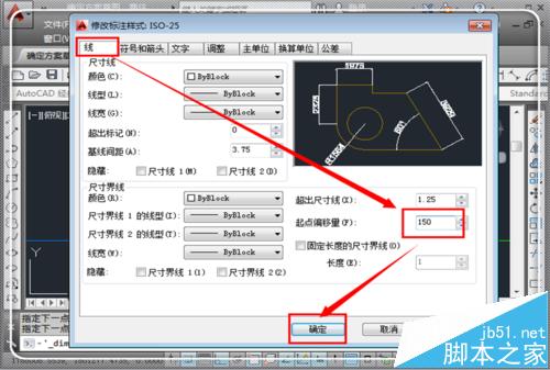 6、然后点击“线”,在线栏目下,点击“起点偏移量”将起点偏移量设置大一些,设置技巧为与绘制的图尺寸相当,这样标注偏移就会明显一些,然后点击“确定”。