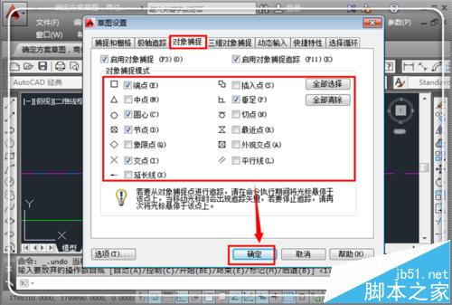 问题二:点击“对象捕捉”,进入捕捉设置,这里去掉不用的捕捉方式,尽量减少捕捉的对象,尤其是“最近点”,这个捕捉方式最容易出问题。去掉不用的捕捉方式前面的勾之后,点击“确定”,回到绘图界面。