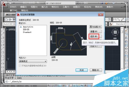2、进入标注样式管理器后,这里可能会有很多样式,如果样式很多,可以在“样式”栏目下点击选择自己想修改的“样式”,如果想让他默认,就不用去选择。如果不想更改样式,只想新建一个样式来临时使用,可点击“新建”新建一个样式来进行更改,更改方式和下面一样。这里以默认的样式作为修改对象,因此点击“修改”。
