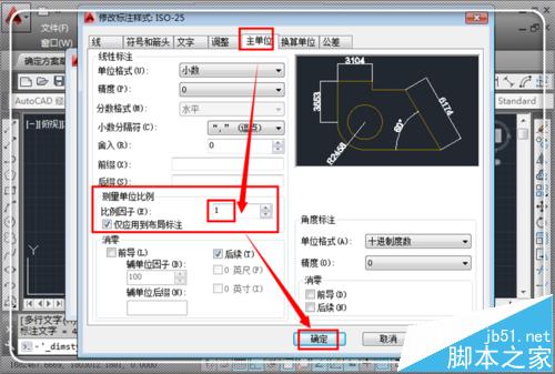 3、进入“修改标注样式”管理器,点击“主单位”,然后点击“测量单位比例”将其比例设置为1,然后点击“确定”。(注:这个方式的用处就是按比例标注,如果你绘制的是2mm,而你想标注成4mm,你就可以设置为2)。