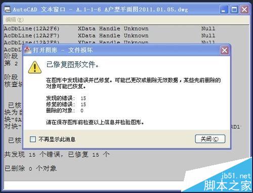 2、清理完成后,我们需要对图形进行修复,如果此时你的图还处于打开状态,那么你输入核查命令audit,会出现以下下对话框。