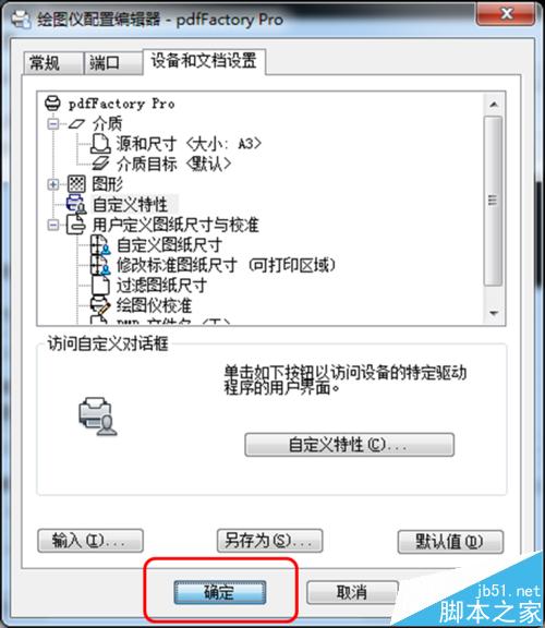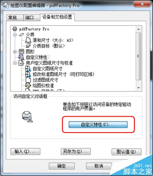 3、在“绘图仪配置编辑器”对话框中单击“自定义特性”。