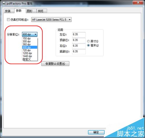 4、在弹出的“pdfFactory Pro属性”对话框中首先进入“参数”选项卡,将分辨率设置为600dpi(分辨率也可自行定义,分辨率越高打印质量越好,同时也意味着文件体积越大!)。