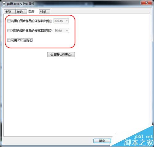 5、在“pdfFactory Pro属性”对话框中选择“图形”选项卡,将该选项卡中所列出的项目全部取消勾选。单击“确定”,完成pdfFactory Pro属性设置。