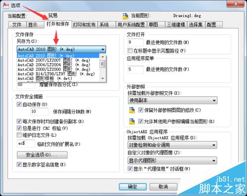 如果往来的经常是2004、2007等低版本CAD图形文件,每次保存时需要在【文件类型】中选择会很麻烦。可以:OPtions命令打开【选项】窗口,在【打开和保存】选项卡里,将【另存为】设置为需要的低版本,以后保存时默认的就是这个版本。