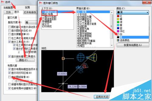 每次安装CAD初次使用时,图形窗口默认的是白色背景,长时间绘图时不利于视力保护。OPtions命令打开【选项】窗口,选择【显示】选项卡里的【颜色】,在打开的【图形颜色窗口】中,分别将“二维模型空间”和“图纸/布局“的”统一背景“的【颜色】设置为黑色。为了让图纸空间图纸以外区域的背景也显示为黑色,在回到【显示】选项卡时,还要去除【显示图纸背景】前面的勾选。