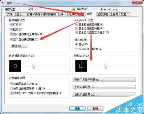 捕捉靶框碰到图形对象的边或点时,才会进行对象捕捉。但在高版本CAD中,由于可以用捕捉标记明确地指示当前可能的捕捉点,默认是不显示捕捉靶框的。根据个人习惯,可以用apbox设置是否显示捕捉靶框,用aperture设置捕捉靶框大小,通常设置为10。也可以OPtions命令打开【选项】窗口,在【草图】中设置。