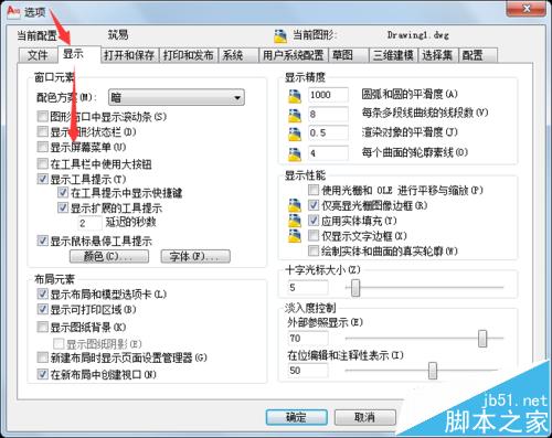 在CAD中,通过鼠标键的快捷操作和Zoom缩放、Pan平移等命令已经可以很方便地浏览图形了,因此完全可以去除占用图形窗口区域的滚动条:OPtions命令打开【选项】窗口,在【显示】选项卡中,去除【图形窗口中显示滚动条】前面的勾选。