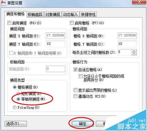 2、打开“捕捉和栅格”的选项,捕捉类型选择“等轴测捕捉”。打开“正交模式”