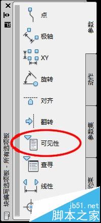 3、进入块编辑器,在“块编写选项板”的“参数”一栏中点击“可见性”。