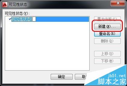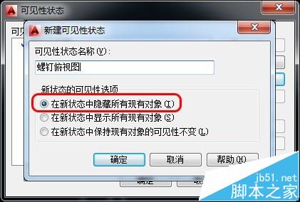 6、点击“新建(N)...”后弹出“新建可见性状态”对话框。将新的状态命名为“螺钉俯视图”。新状态的可见性选项选择第一个“在新状态中隐藏所有现有对象”。两次点击确定后返回块编辑器。