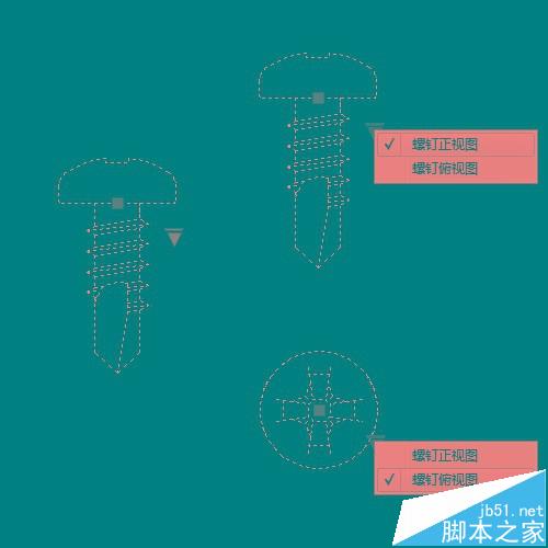 8、退出块编辑器,选择螺钉块参照,可以看到螺钉旁边多了一个三角形按钮,点击该按钮会出现一个菜单,菜单里包含了“螺钉正视图”、“螺钉俯视图”两个选项。选择不同的选项就可以得到相应的视图。