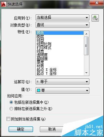 2、然后输入:QSELECT命令,弹出快速选择命令窗口,先选择“如何应用”选第一个,才能激活第一行最后那个小图标(范围搜索),如果选第二个的话就只能全图选择,且排除在外,其余设置如图