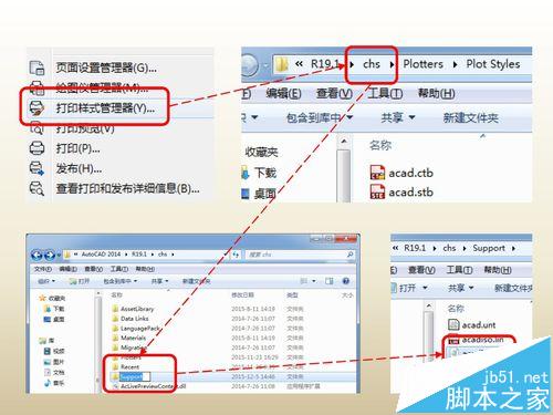 方法二:你嫌麻烦,这里还有一个简便的方法找到这两个文件:在cad“文件”菜单中点击“打印样式管理器”,跳出Plot Styles文件夹,再向上返回两级到达“chs”文件夹,然后在此文件夹中找到“support”文件夹并进入,此时就可以找到两个后缀名为“.pat”的文件了。