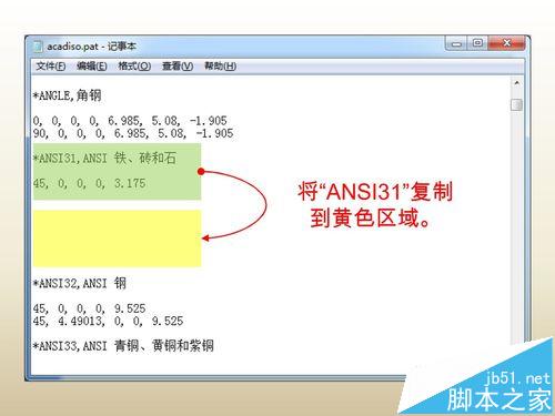 1、将“ANSI31”图案的所有数据复制到记事本中的空白区域(即图中的黄色区域)。注意,一定不要插入到其他图案数据当中,以免造成混乱。