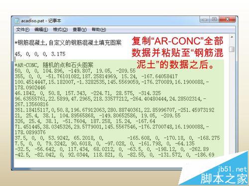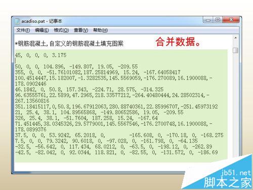 4、除“*AR-CONC,随机的点和石头图案”一行文字、合并数据,然后保存记事本(可暂不关闭记事本)。