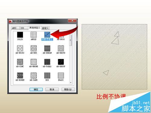 5、回CAD,调用填充命令,使用自定义的图案以检查其填充效果(如果未能找到刚刚定义的图案可以重新启动CAD)。从下图中可以看到两种图形显示比例不协调,斜线较密,需要进一步调整其比例。