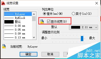 3、点击【线宽】功能选项,弹出线宽设置对话窗口,通过该对话窗口可以发现勾选了显示线宽的选项,这也是为什么图像的线宽比较粗,图像模糊的根本原因,如下图所示。