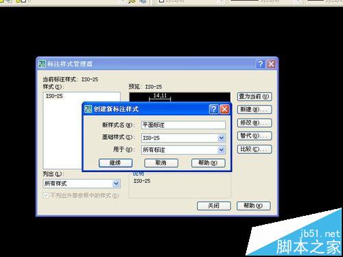 2、打开标注样式管理器,快捷键D,新建一个样式,名称改为“平面标注”,然后点击继续,开始进行下一步的设置
