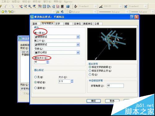 2、符号和箭头中,第一项选择建筑标记,箭头大小改为40(参见下图)。