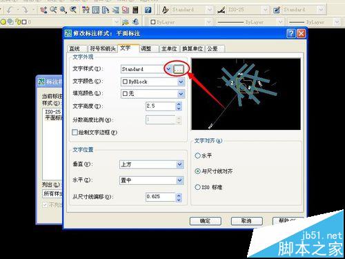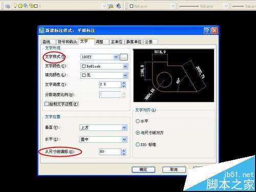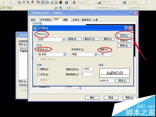 3、文字,修改文字样式,点击后面那个方块,出现一个对话框,样式名称为180TT,字体改为宋体,下方有“使用大字体”,不做勾选,高度为180,编辑结束后,点击应用,关闭。退出对话框后,将“从尺寸线偏移”改为60.
