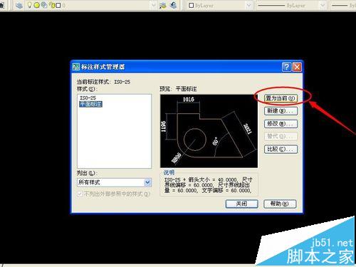回到初始对话框,选择刚才编辑的“平面标注”,点击“置为当前”,这下就可以为你的图纸进行标注了。