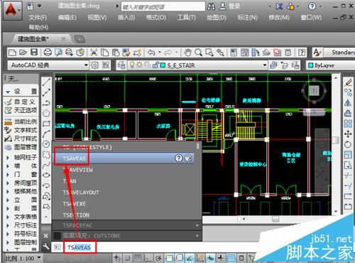 2、在命令栏输入“ts”,这时候会自动弹出和ts相关的选项,选择“TSAVEAS”。