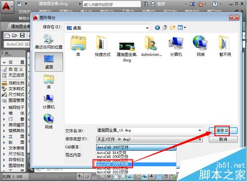 5、点击“CAD版本”后面的倒三角形,选择较低的版本,如CAD2007,最低的CAD2004,选择之后点击“保存”。