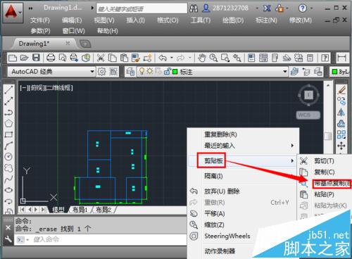 2、进入CAD界面,点击右键,弹出快捷操作方式,然后点击“剪贴板”,在弹出来的快捷方式中,点击“带基点复制”。