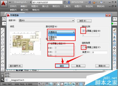 4、这里可以进行各种个性化的设置,注意,由于插入的图片一般默认有插入的路径,如果你的源文件更改,也就是原来的图片位置改动,很可能导致这个插入的图片不能够在CAD中显示,因此,如果不是想他们关联,点击“无路径”;这里还可以指定插入的比例,旋转的角度等,选择完毕,点击“确定”。