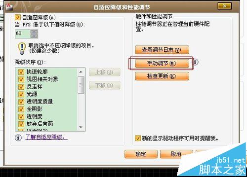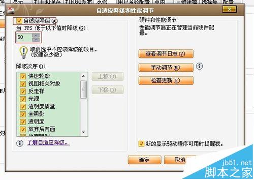 2、将自适应降级勾选。 当FPS低于60时降级(FPS默认值是5)。