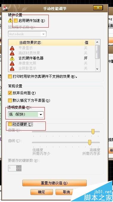 3、还是在性能面板,右边,打开硬件加速“手动调节”,将手动调节勾去掉,下面照图做: