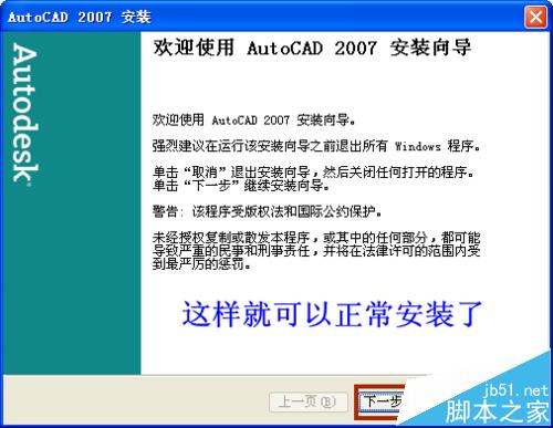 5、这样就解决了上述的错误提示。“下一步”,开始安装。