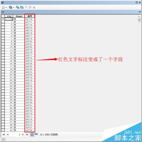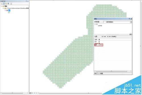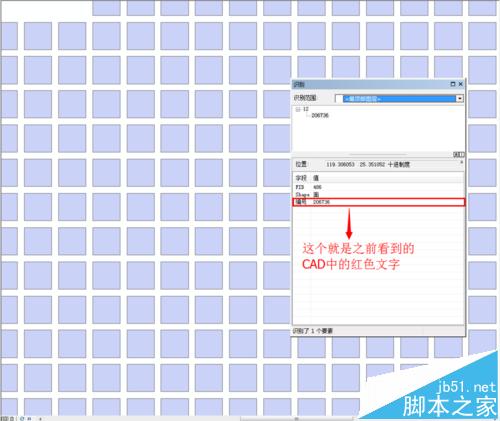 可以看到,之前的CAD线框被转换成了ArcGIS的面,而且用识别工具点一下任意一个面可以识别出他的属性,其中的“编号”一行就是CAD中的红色文字(说明一下:这里看到的和之前的红色文字不一样,是因为在转换的时候对文字进行了修改,后面会说到,如果不修改就是一样的)。同时,如果我们打开图层的属性表,可以看到属性表中有一行“编号”字段,存储的就是CAD中的红色文字。