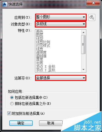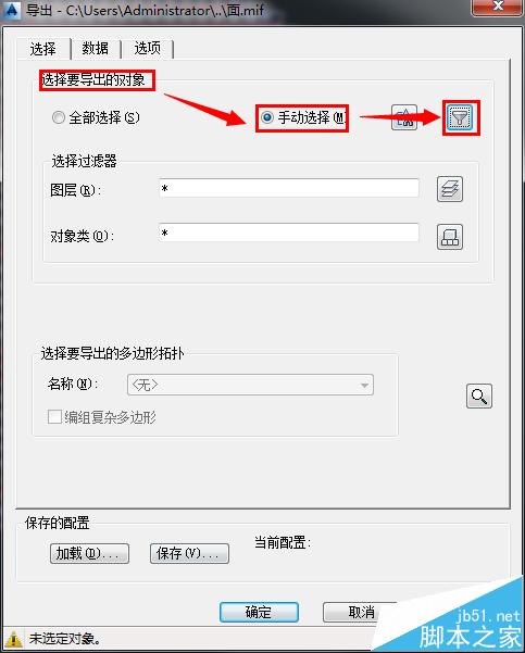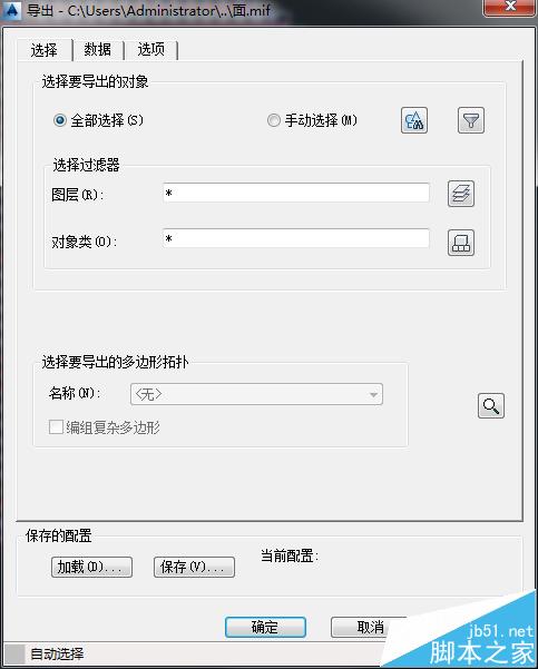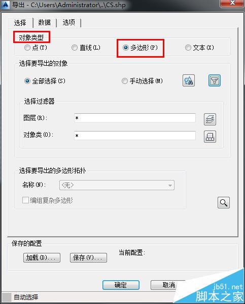 ,这里是导出的关键步骤。点击“选择”,进入“选择”分页在“选择要导出的对象”一栏选择“手动选择”,点击过滤符号 进入“快速选择”界面,在“应用到”一栏选择“整个图形”,“对象类型”选择“多段线”,“特性”不动,“运算符”选择“全部选择”,其余默认。