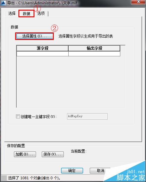 同样的步骤,我们再将文字导出成mif格式的文件,将文件命名为“文字”。这里和导出多段线有点区别,首先是在图9那里,“对象类型”要选择“文字”;设置界面处,我们需要点击“数据”分页,点击“选择属性”,在弹出的“选择属性”对话框中双击“特性”勾选上“字符串”,点击“确定”回到“数据”分页,再次点击“确定”开始输出文字的mif文件。