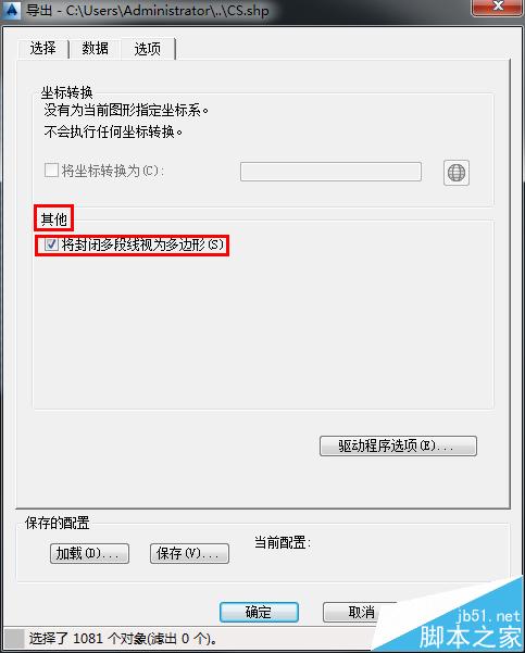 点击软件左上角的图标 ,同导出mif一样,在下拉菜单中选择“导出”→“其他GIS格式”,在“导出位置”对话框将文件类型修改为shp,这里将导出的文件命名为“CS”,点击“确定”,进入导出设置的对话框。点击“选择”分页,在“对象类型”一栏选择“多边形”;点击“数据”分页,点击“选择属性”按钮,在弹出的“选择属性”对话框中双击“对象属性”,将“面”勾选上(如果没有此步骤导出的shp文件也会没有属性),单击“确定”回到导出设置界面,在“输出字段”处将其字段名修改为“编号”,这个字段名即为我们之前在ArcGIS内看到的那个字段名;点击“选项”分页,在“其他”一栏勾选上“将封闭多段线视为多边形”(若没有此步骤将无法将封闭的多边形导出成面),点击“确定”开始导出成shp文件。