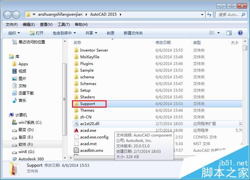 5、进入cad安装文件位置之后,找到“support”文件夹,点击打开它。