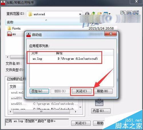 6、当as.lsp 应用程序出现在启动组中时,点击关闭,然后把加载/卸载应用程序窗口关闭.这样文本数字求和工具 as.lsp就安装好了.