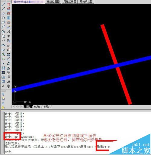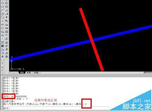 命令行提示选择对象,这时选择蓝线,回车,提示“输入对象排序选项 [对象上(A)/对象下(U)/最前(F)/最后(B)]”,这里我们输入B,回车。可以看到蓝线到了红线之下。