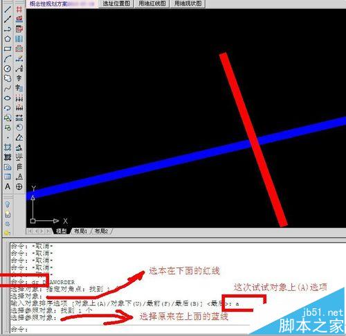 同理,输入A,回车,再选择蓝线,也可以达到目的(即把红线这个对象置于蓝线这个对象之上)。