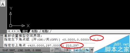 3、设置图型界限。如果,你想设置A4纸大小,就要继续输入0,0;210,297。如下图一。当然A3的纸大小是297mmχ420mm,那么,你就要在命令框中输入 0,0 ;297,420。