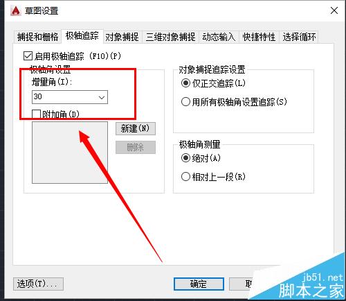 3、可以看出来,出现绿色虚线的时候,其角度都是30的倍数,我们打开极轴追踪的“正在追踪设置”,找到增量角,发现这里的数字是30,也就是说按照30的增量递增,30,60,90,120,150......都可以成功被捕捉到。
