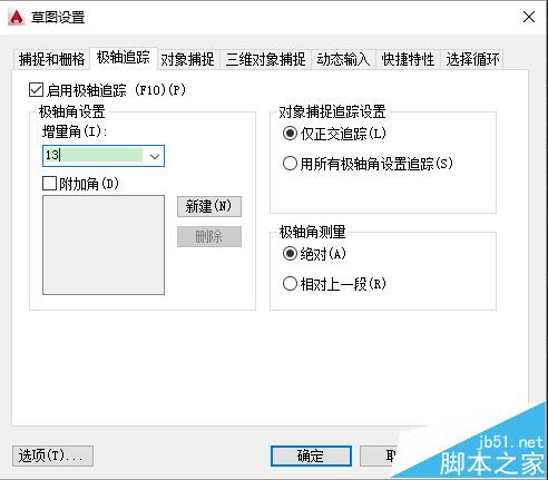 4、所以如果是常用的角度,类似30度,45度,60度,90度,180度这样的就可以在极轴捕捉里面选择一行数进行捕捉。但是如果是不常用的,例如13度这样的数字怎么办呢?回到刚刚增量角那里,我们将增量角的数字改成13,再回到主界面进行直线绘制。