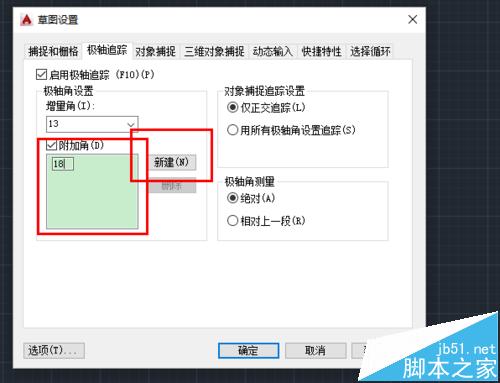 5、这样设置虽然很精确捕捉到了13度,但是依然是递增的,就是下一个被捕捉的是26度,假如在绘制时我想捕捉一个18度的,这里就无法捕捉到。解决方法是利用附加角。在增量角下面有一个附加角选项,勾选一下,然后点击新建,输入18.回到界面,使用直线工具。